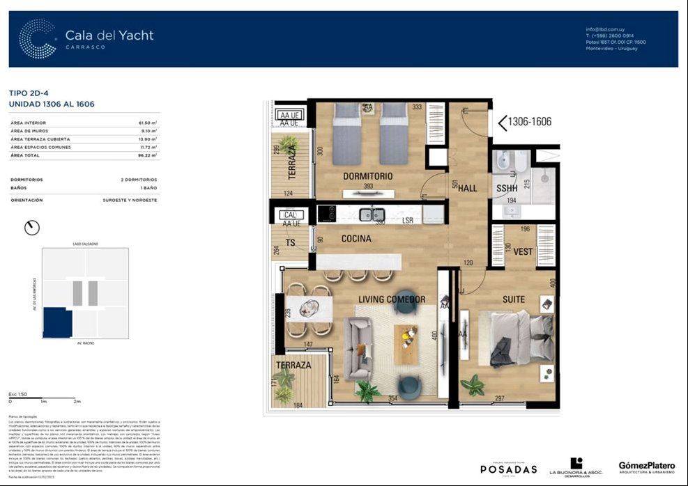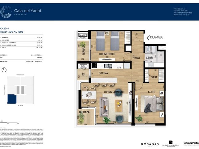 Cala del Yacht tendrá un equilibrio perfecto entre naturaleza y ciudad. Su privilegiada ubicación, en Avenida de las Américas y Avenida Racine, invita a tener un nuevo estilo de vida en Carrasco. La primera torre contará con 17 pisos, y 108 unidades, de 1, 2 y 3 dormitorios.