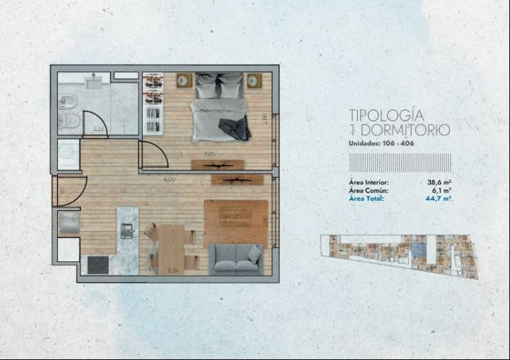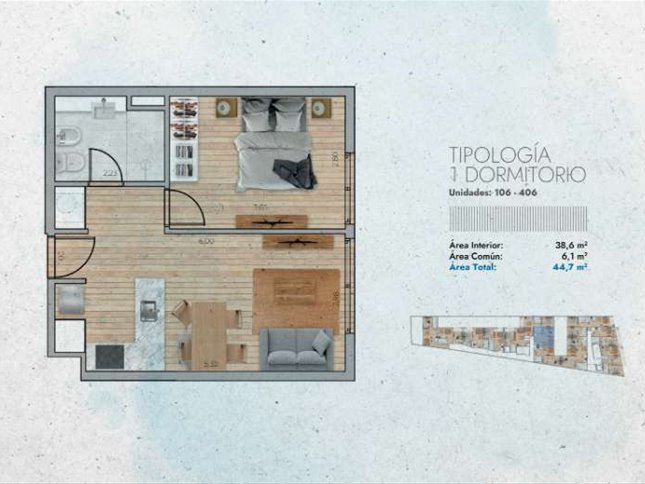1 DORM1 BAÑO45 m² SUP.39 m² EDIF.