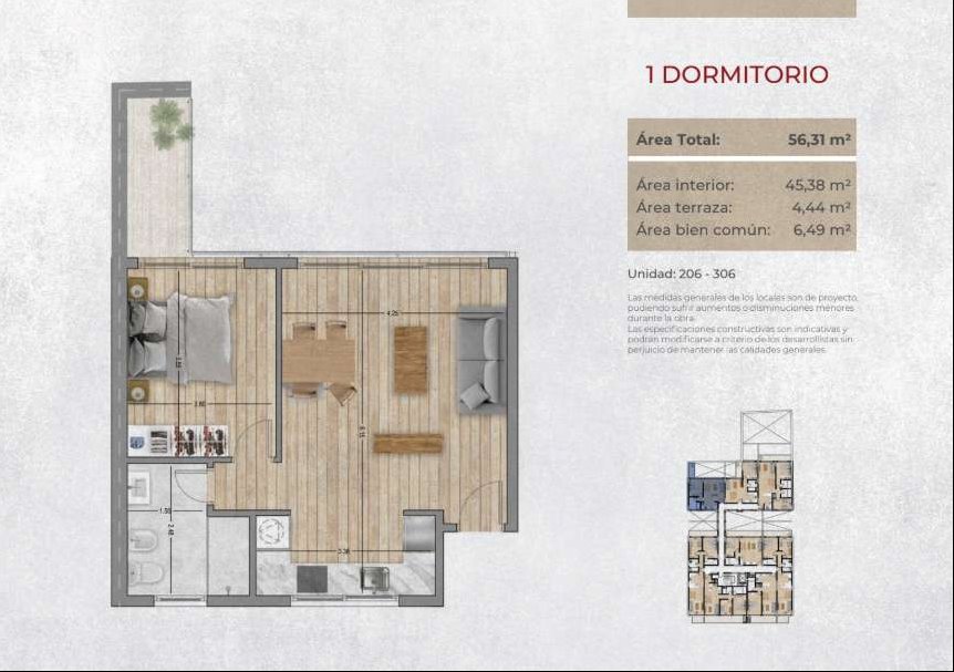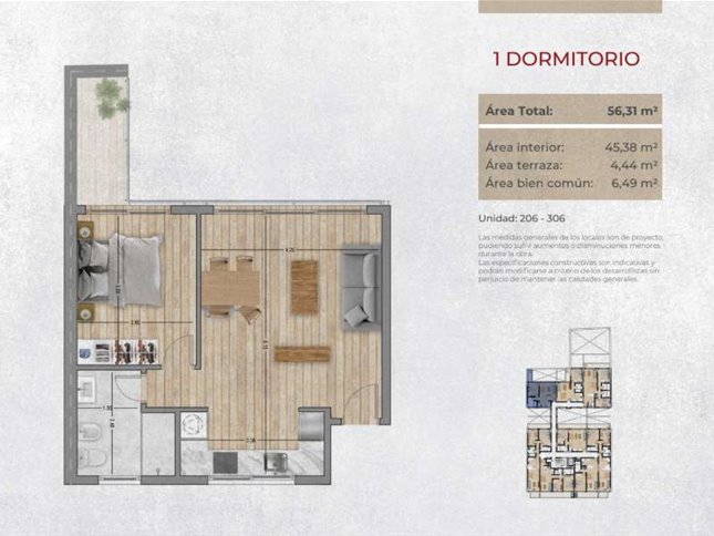 1 DORM1 BAÑO56 m² SUP.45 m² EDIF.