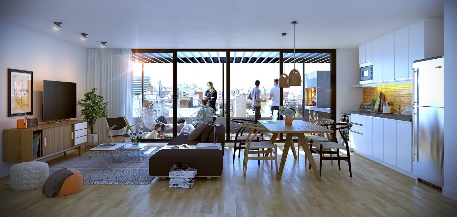 -Baño, cocina integrada, lavadero, living comedor y terraza.