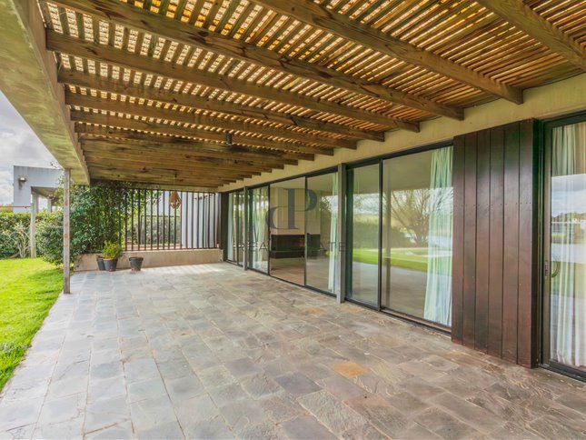 El exterior ofrece una galería techada con pérgola, ideal para disfrutar del entorno verde. El jardín cuenta con sistema de riego automatizado con bomba. Aire acondicionado en todos los ambientes para máximo confort.
