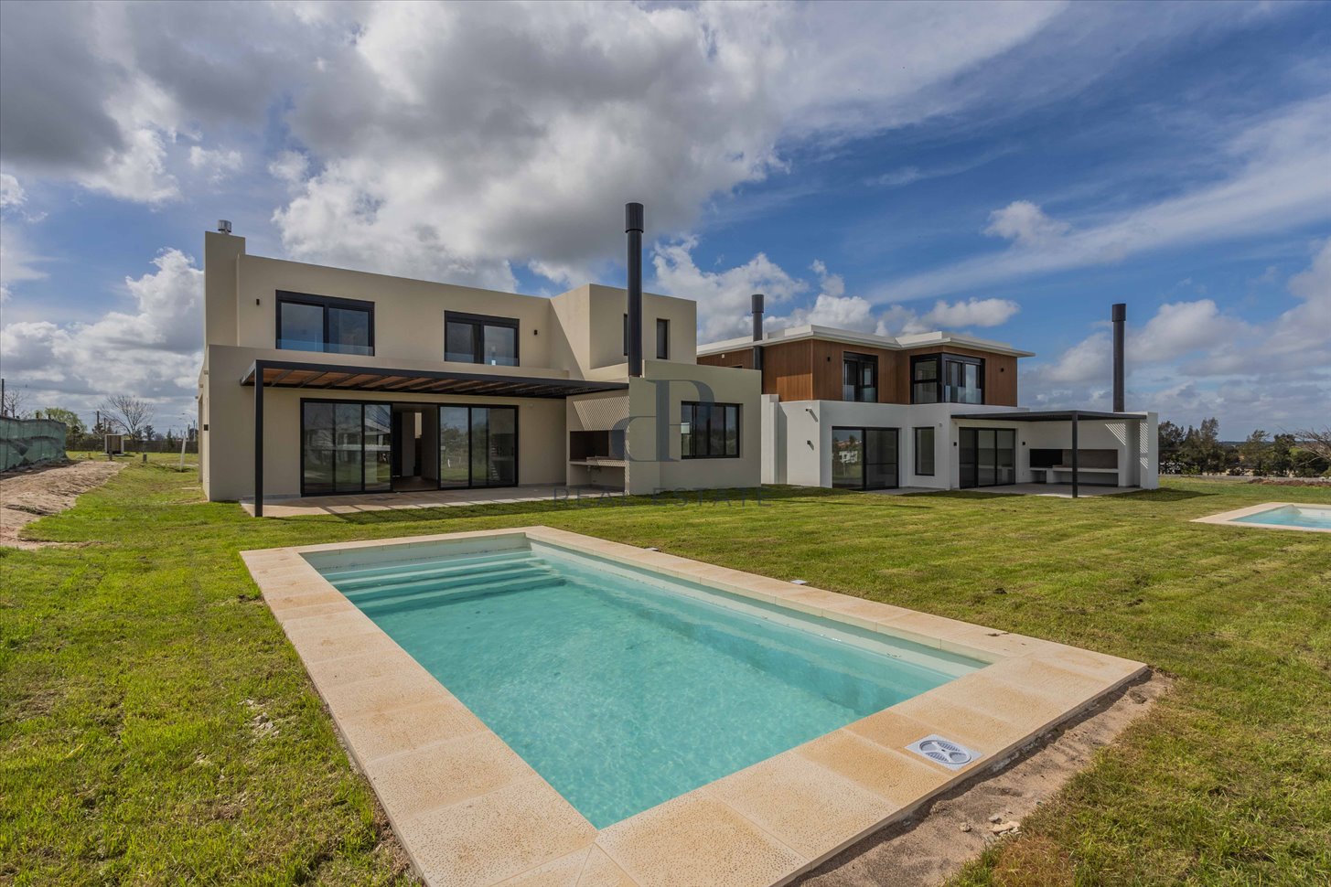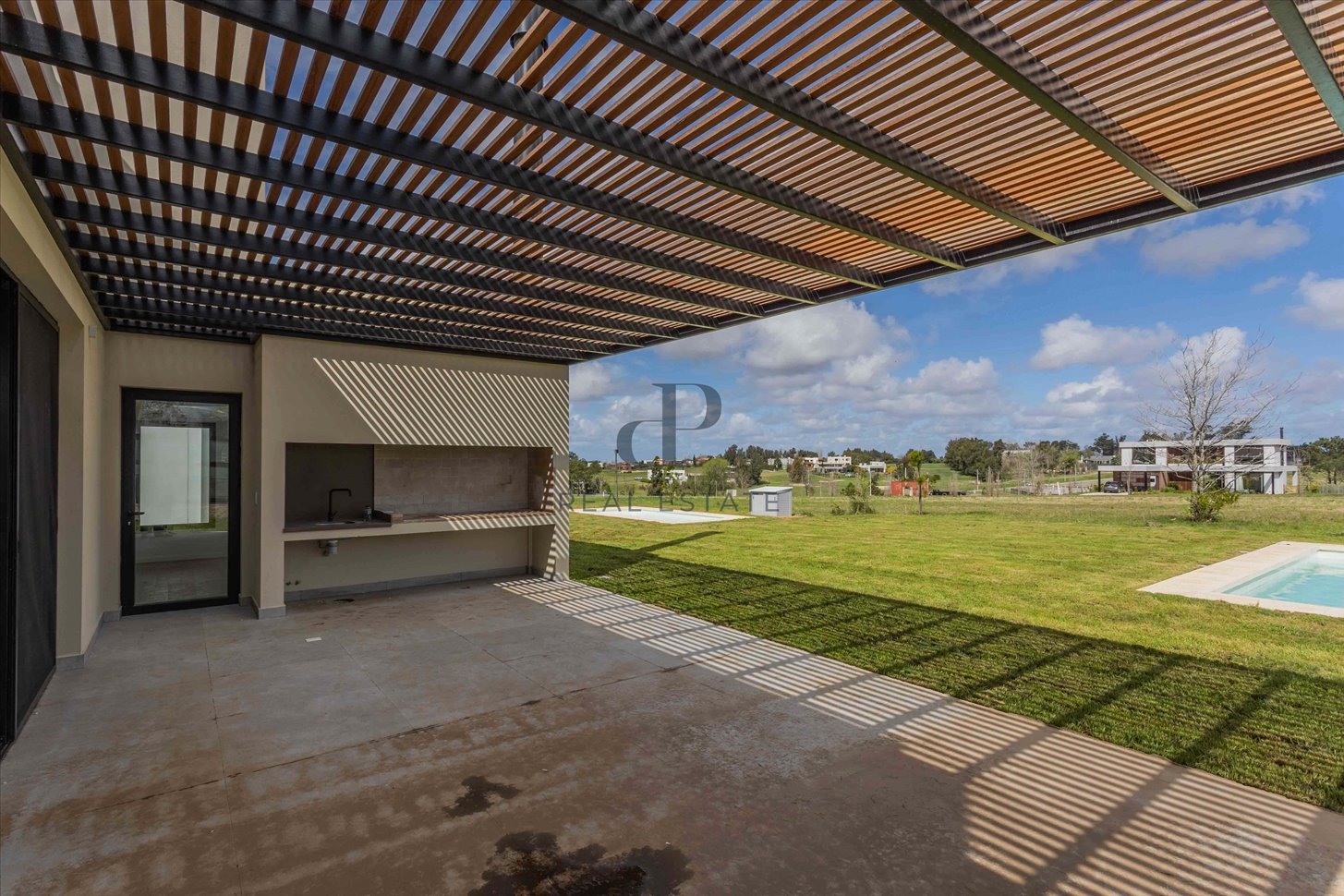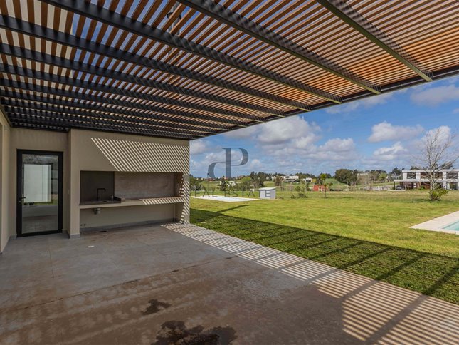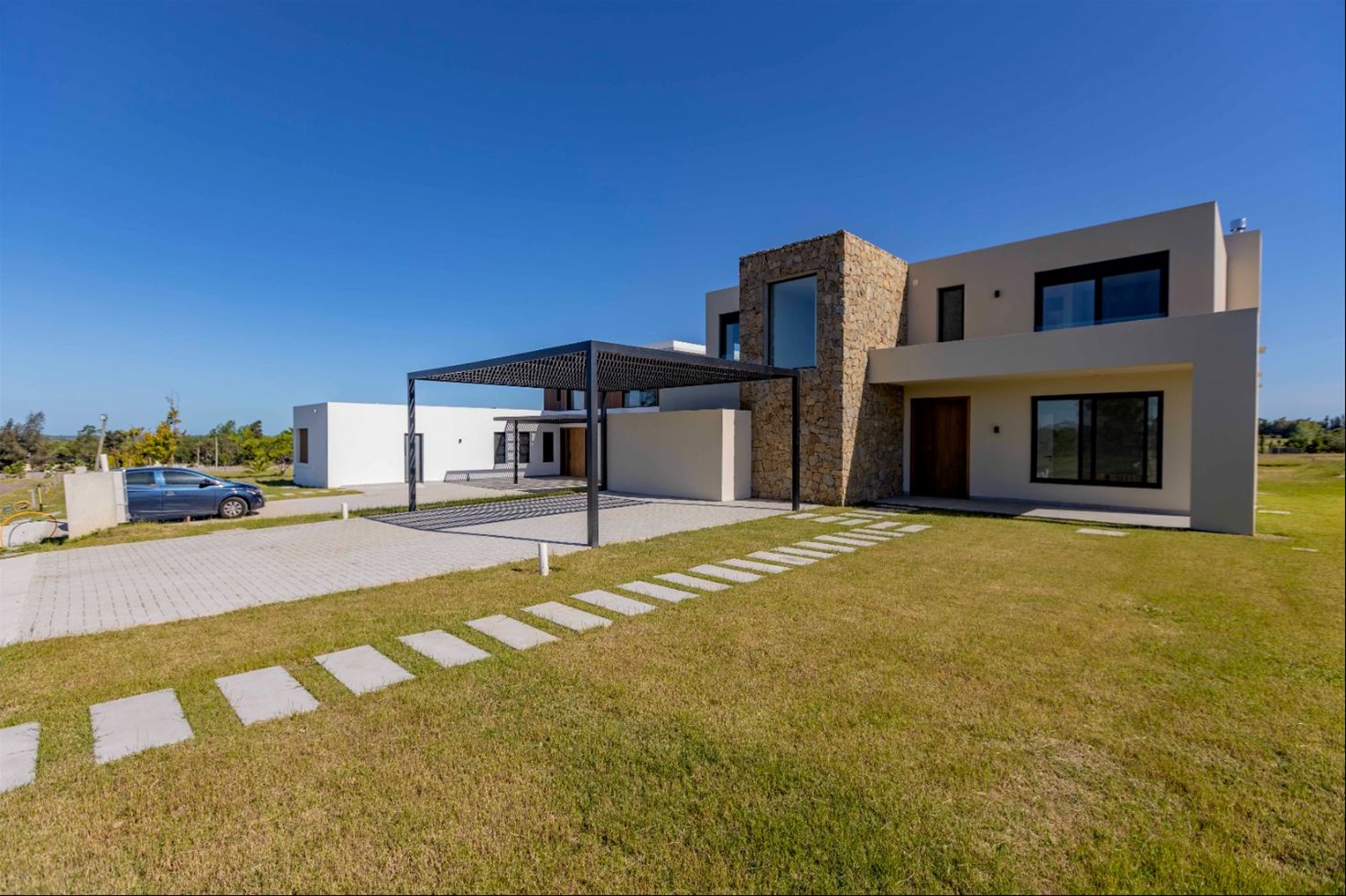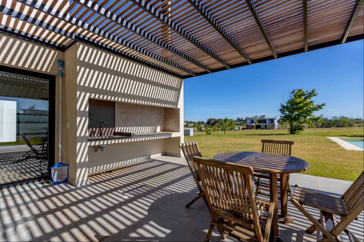 Acceso peatonal con porche de entrada, pérgola para vehículos y otra pérgola con parrillero. Piscina integrada al entorno, completando un espacio exterior pensado para disfrutar.