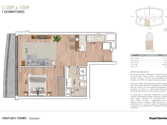 * Las superficies de los apartamentos incluyen muros divisorios hasta su eje, ductos, terrazas, balcones, prorrateo de área común, circulación vertical exclusivamente de planta.