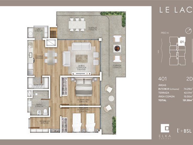 * Las superficies de los apartamentos incluyen muros divisorios hasta su eje, ductos, terrazas, balcones, prorrateo de área común, circulación vertical exclusivamente de planta.