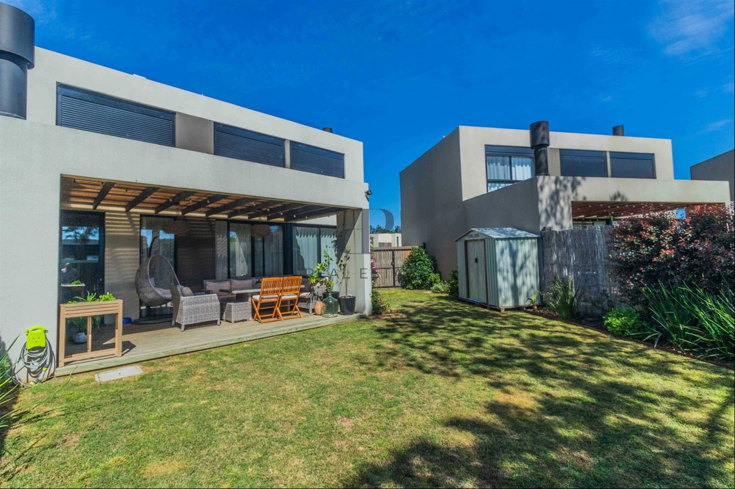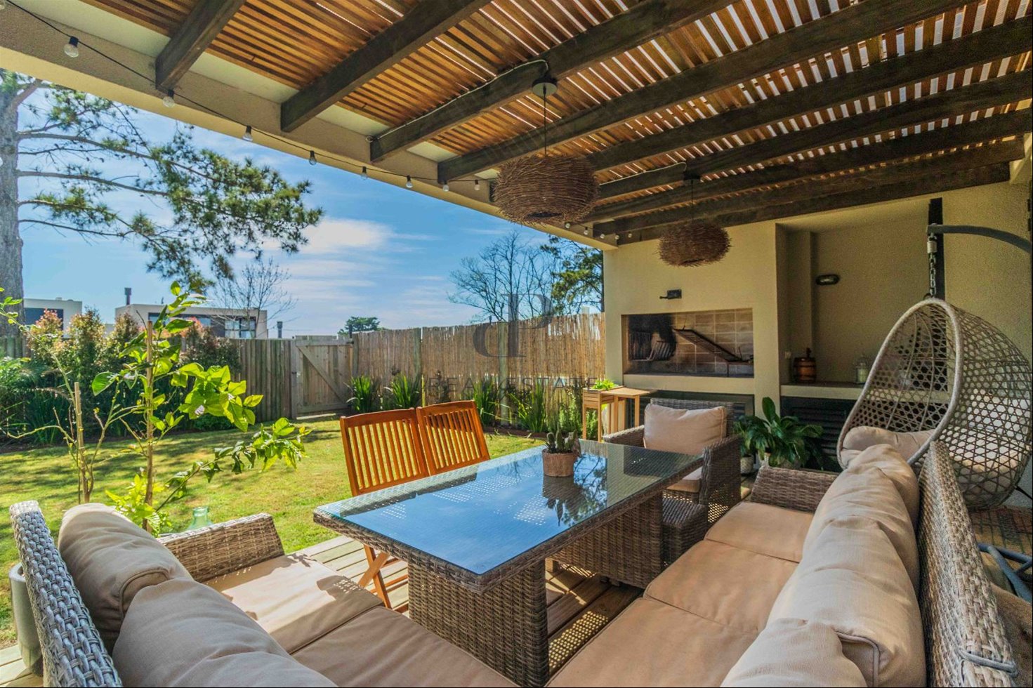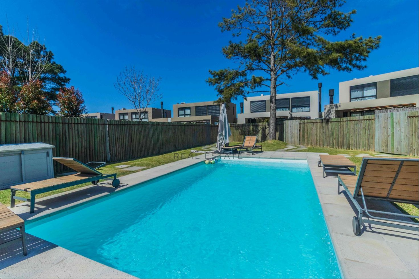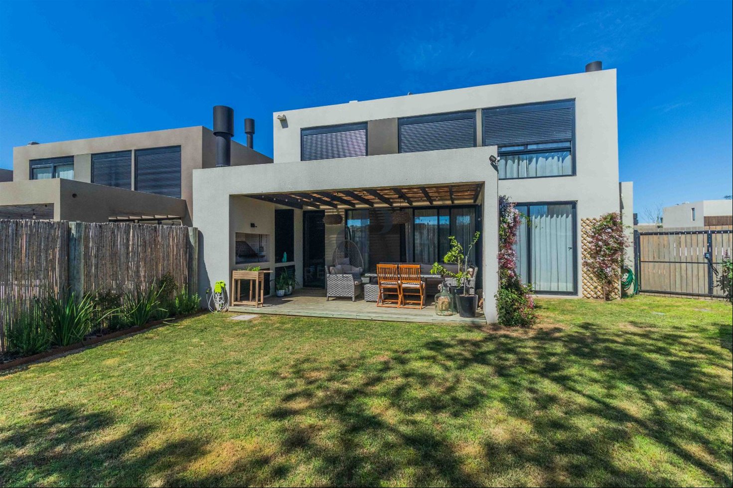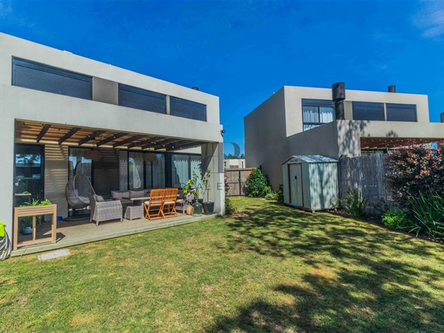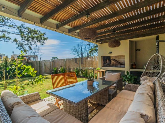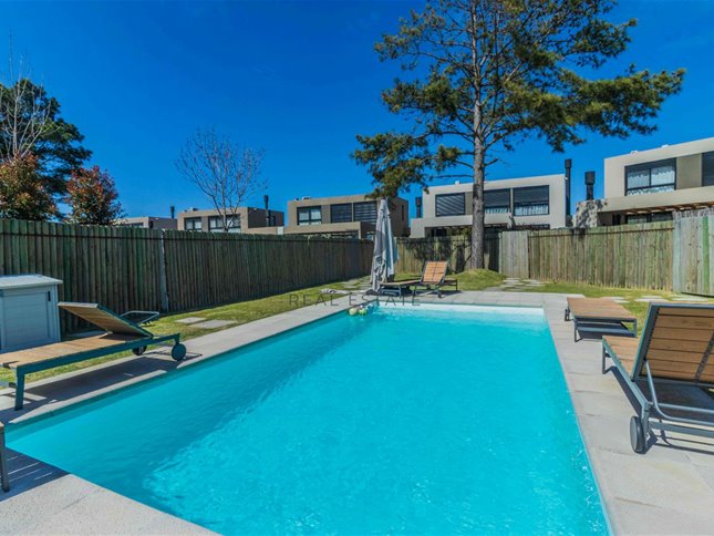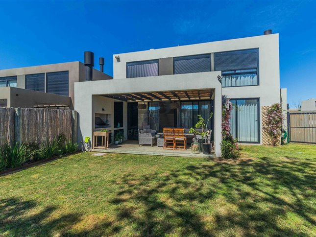 Exterior: Deck con parrillero. Salida a piscina que comparten 5 casas. Cochera para 2 autos.