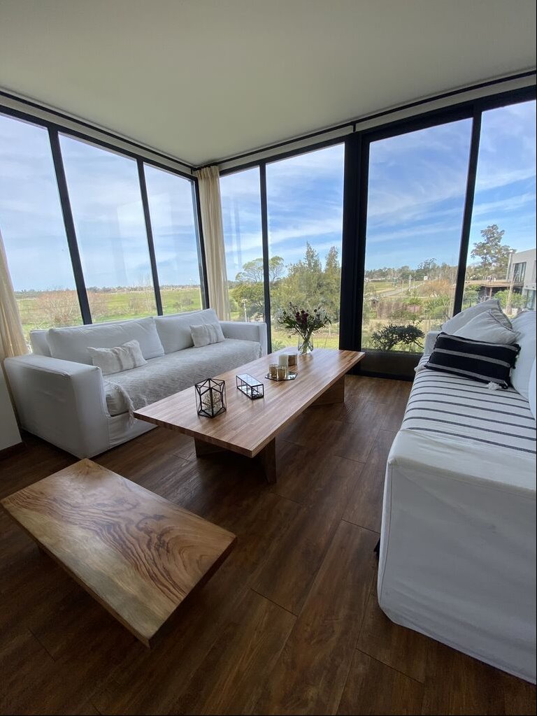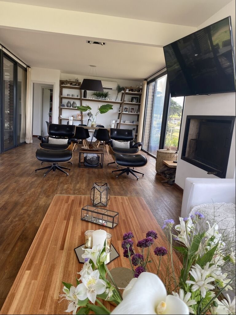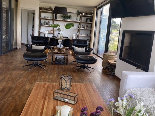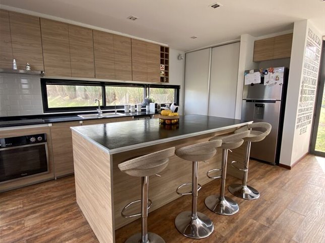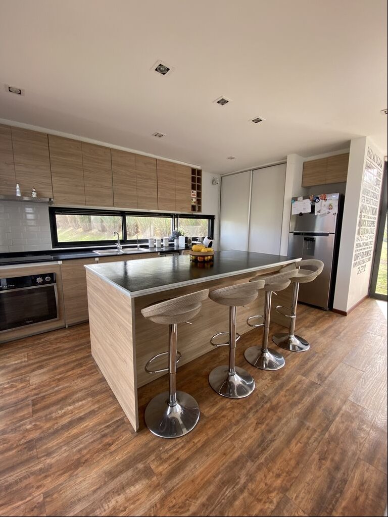 Ofrece un amplio living comedor con estufa a leña, toilette, tres dormitorios —siendo el principal en suite—, además de una gran cocina con isla y dormitorio de servicio completo.