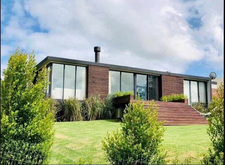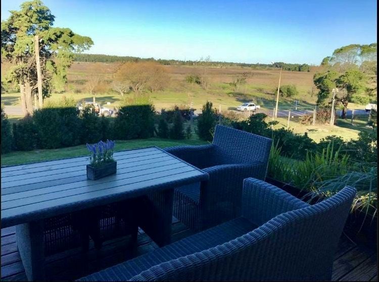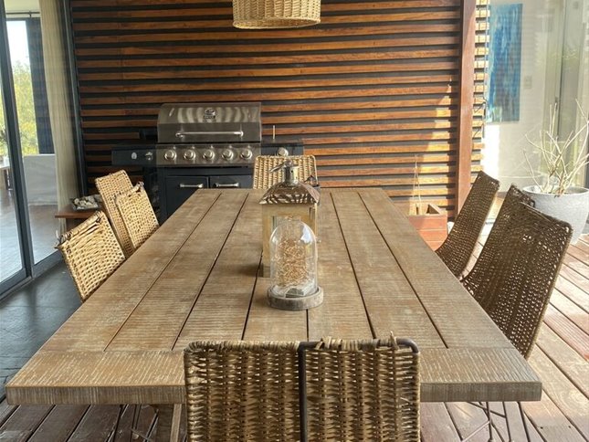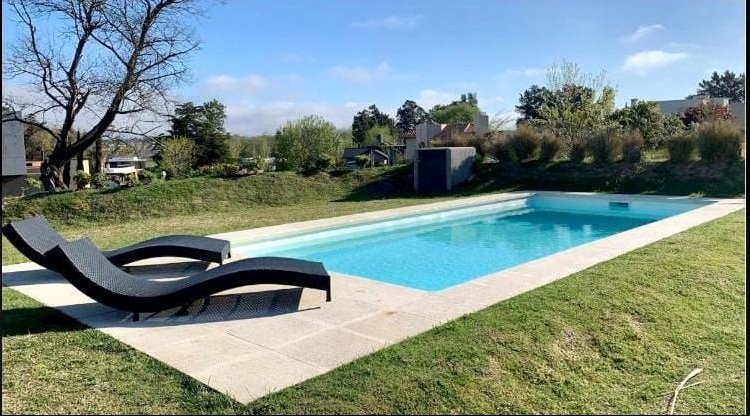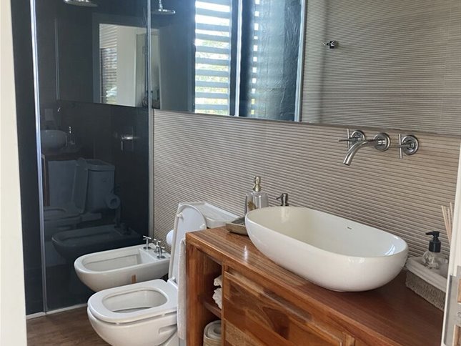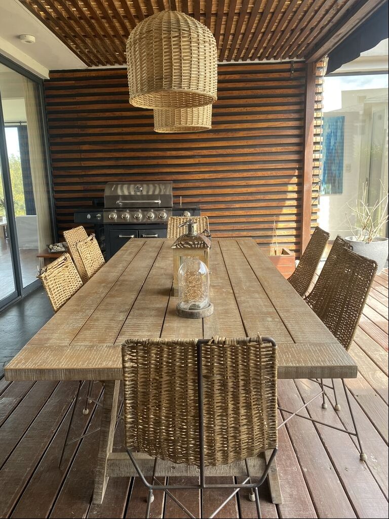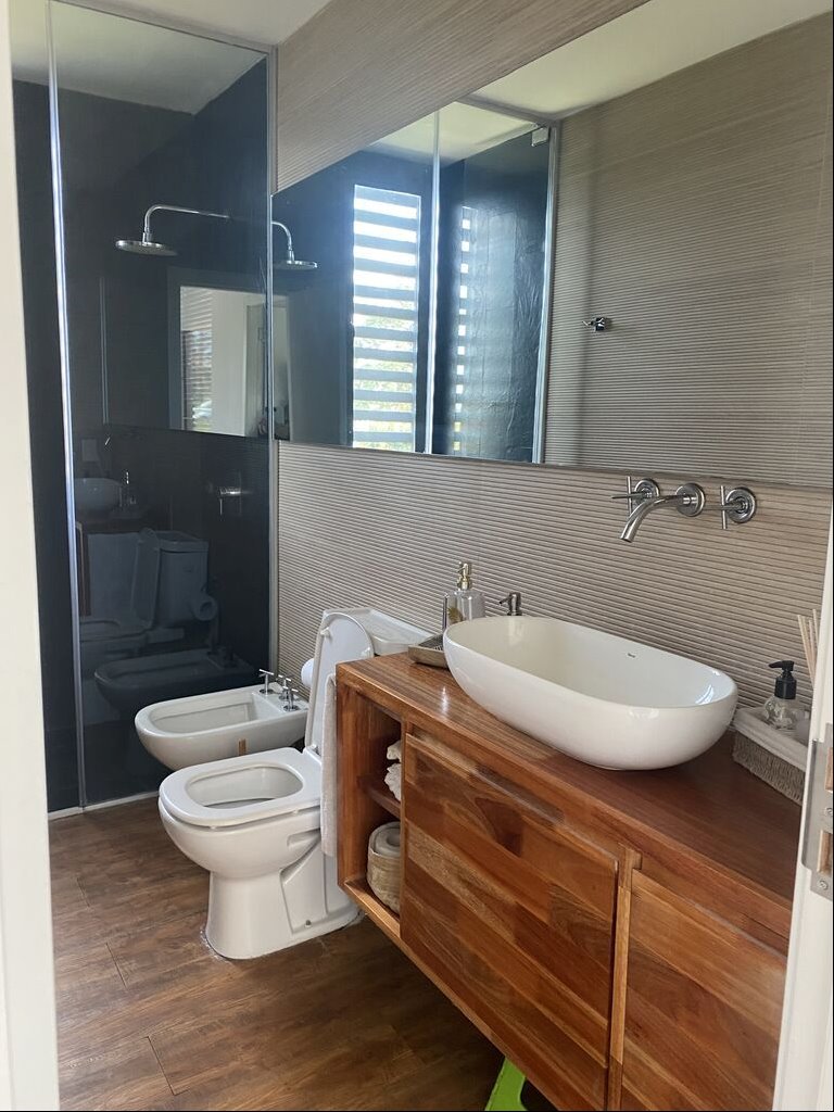 Ofrece un amplio living comedor con estufa a leña, toilette, tres dormitorios —siendo el principal en suite—, además de una gran cocina con isla y dormitorio de servicio completo.