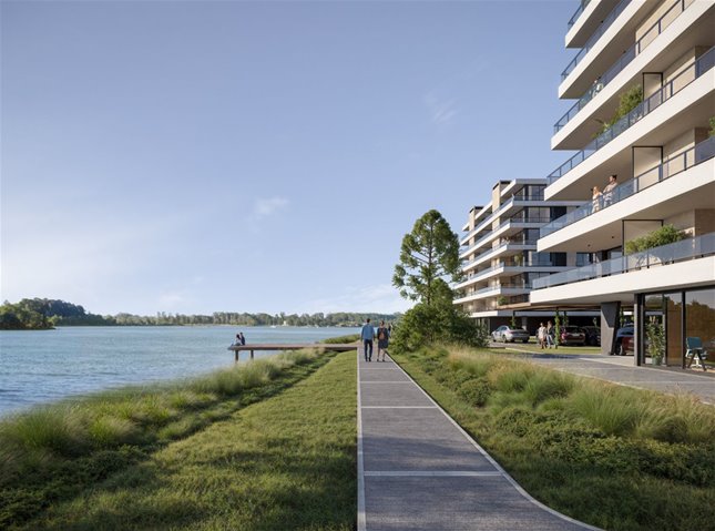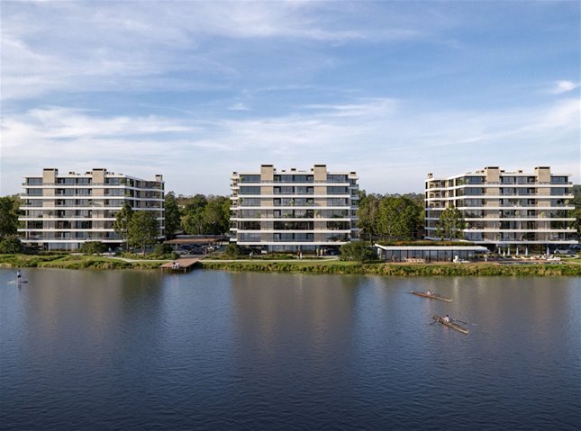 El proyecto incluye tres torres con 123 apartamentos de 1, 2 y 3 dormitorios y 151 cocheras, en un entorno pensado para disfrutar el lago y actividades como kayak o paddleboard.