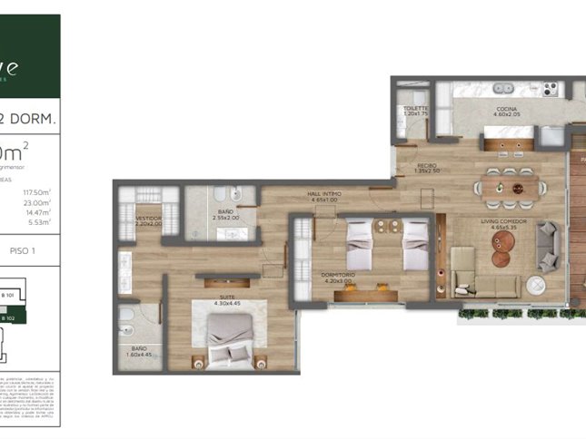 * Las superficies de los apartamentos incluyen muros divisorios hasta su eje, ductos, terrazas, balcones, prorrateo de área común, circulación vertical exclusivamente de planta.