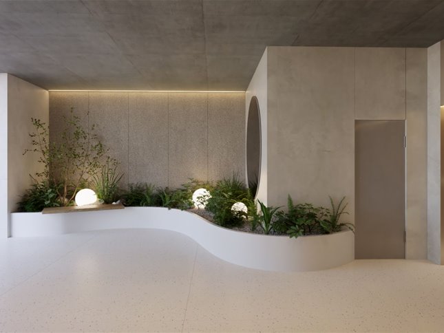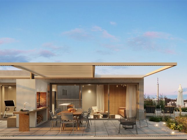 En el nivel 12 se ubican los amenities, que incluyen gimnasio, solárium, coliving y parrillero al aire libre, todos diseñados con mobiliario contemporáneo, detalles naturales y espacios verdes.