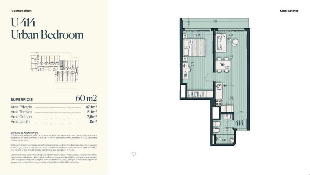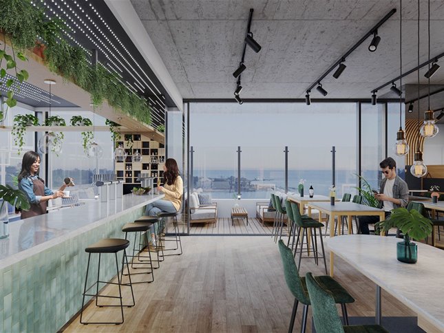 Amenities destacados: Cowork Café, Rooftop Bar, Tech Gym, Spa, Fitness Room, piscina, salas de reuniones y hall de acceso de doble altura con conserjería.