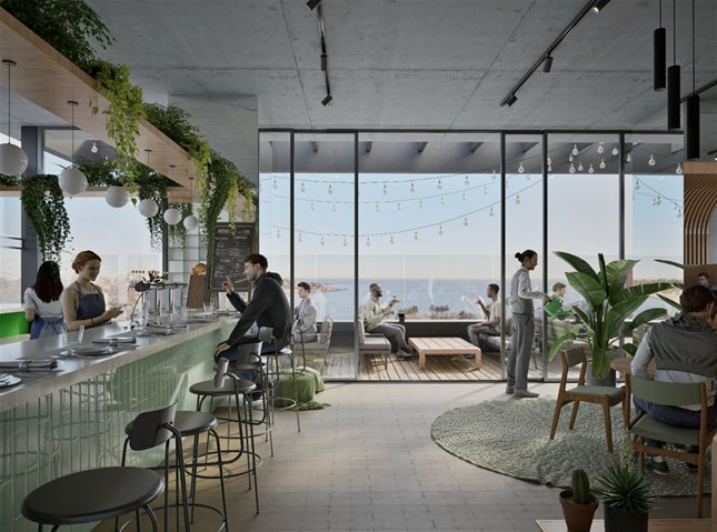 Amenities destacados: Cowork Café, Rooftop Bar, Tech Gym, Spa, Fitness Room, piscina, salas de reuniones y hall de acceso de doble altura con conserjería.