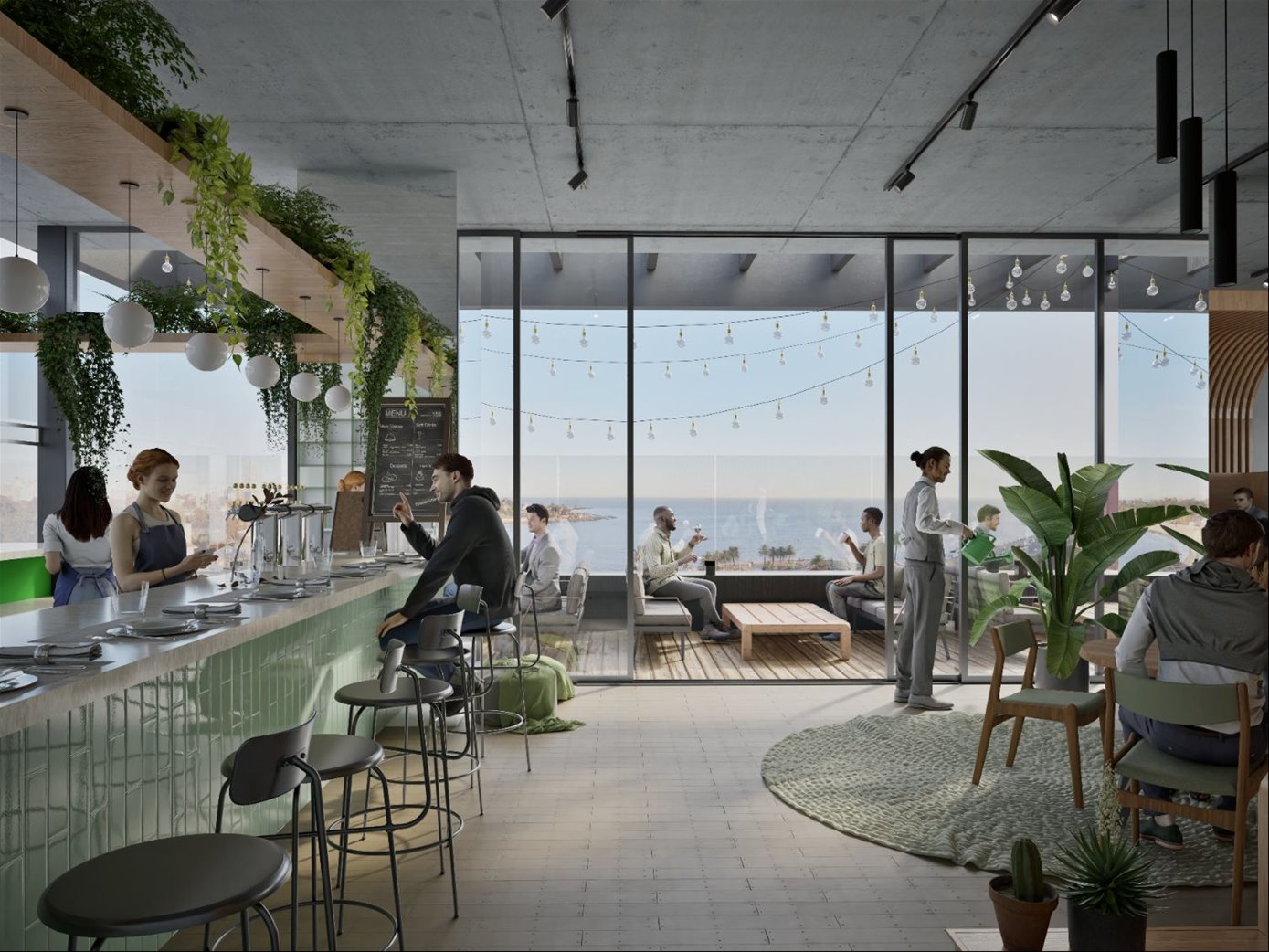 Amenities destacados: Cowork Café, Rooftop Bar, Tech Gym, Spa, Fitness Room, piscina, salas de reuniones y hall de acceso de doble altura con conserjería.