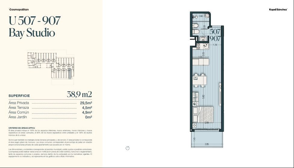 * Las superficies de los apartamentos incluyen muros divisorios hasta su eje, ductos, terrazas, balcones, prorrateo de área común, circulación vertical exclusivamente de planta.
