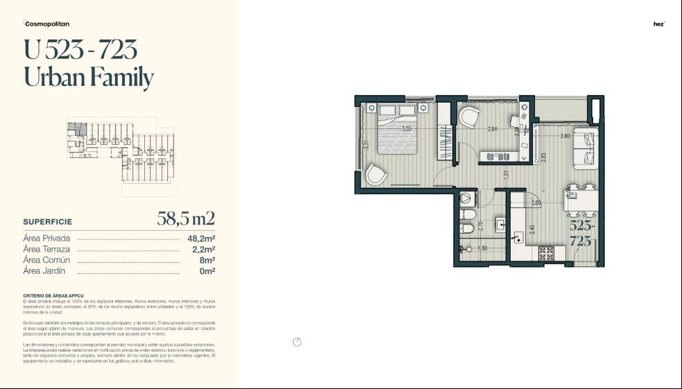 * Las superficies de los apartamentos incluyen muros divisorios hasta su eje, ductos, terrazas, balcones, prorrateo de área común, circulación vertical exclusivamente de planta.