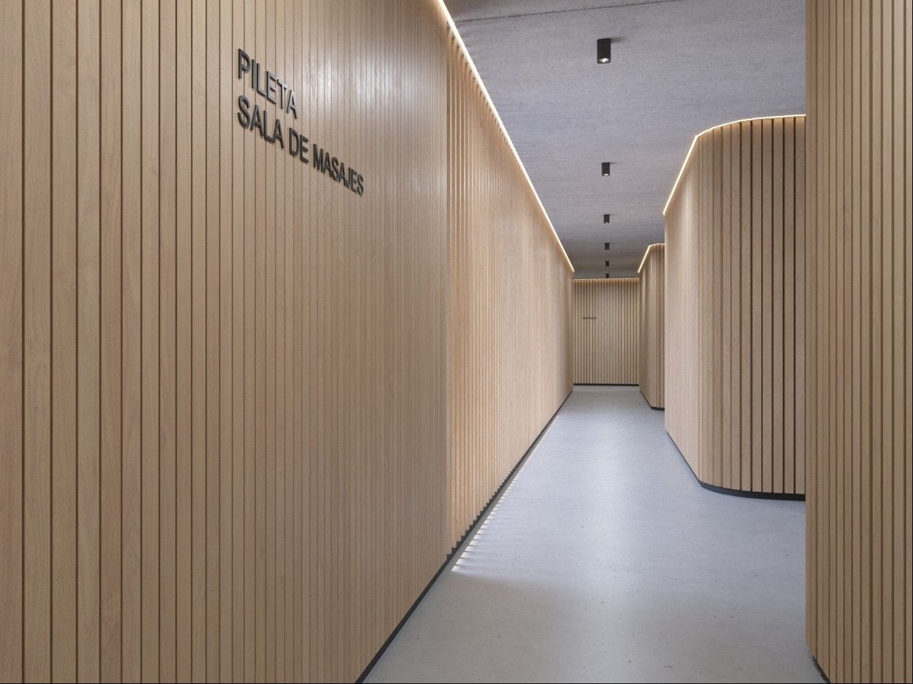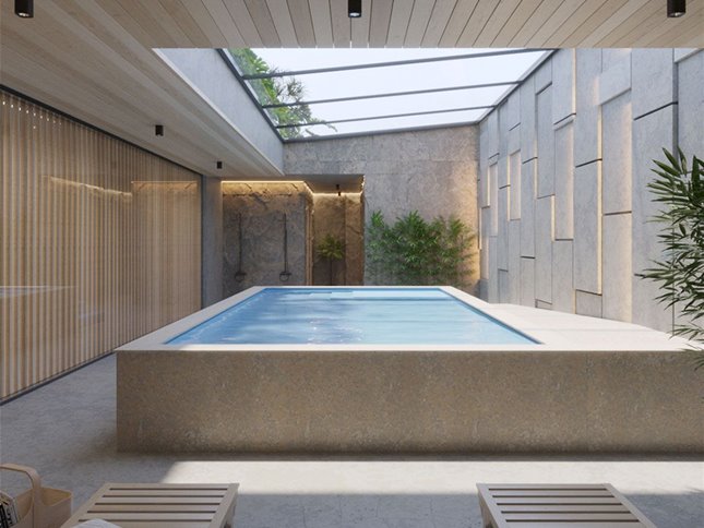 Amenities destacados: Cowork Café, Rooftop Bar, Tech Gym, Spa, Fitness Room, piscina, salas de reuniones y hall de acceso de doble altura con conserjería.
