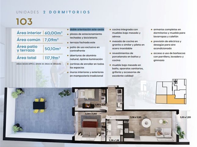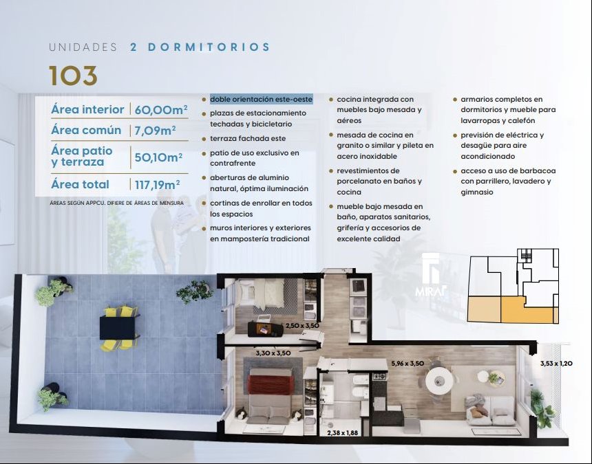 Cocina integrada con muebles aéreos y bajo mesada, mesada de granito, baño con porcelanato y grifería de calidad, armarios completos en dormitorios y previsión para aire acondicionado .patio de uso exclusivo en contrafrente