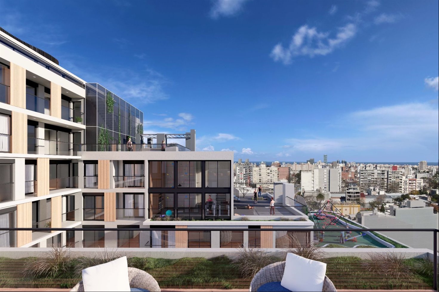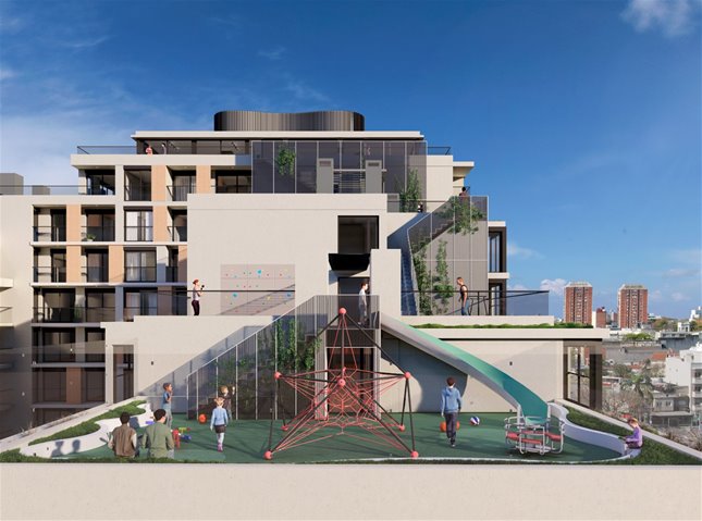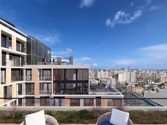 Complejo residencial de 209 apartamentos monoambientes, de 1 y 2 dormitorios, distribuidos en tres edificios con diseño moderno y enfoque sustentable.