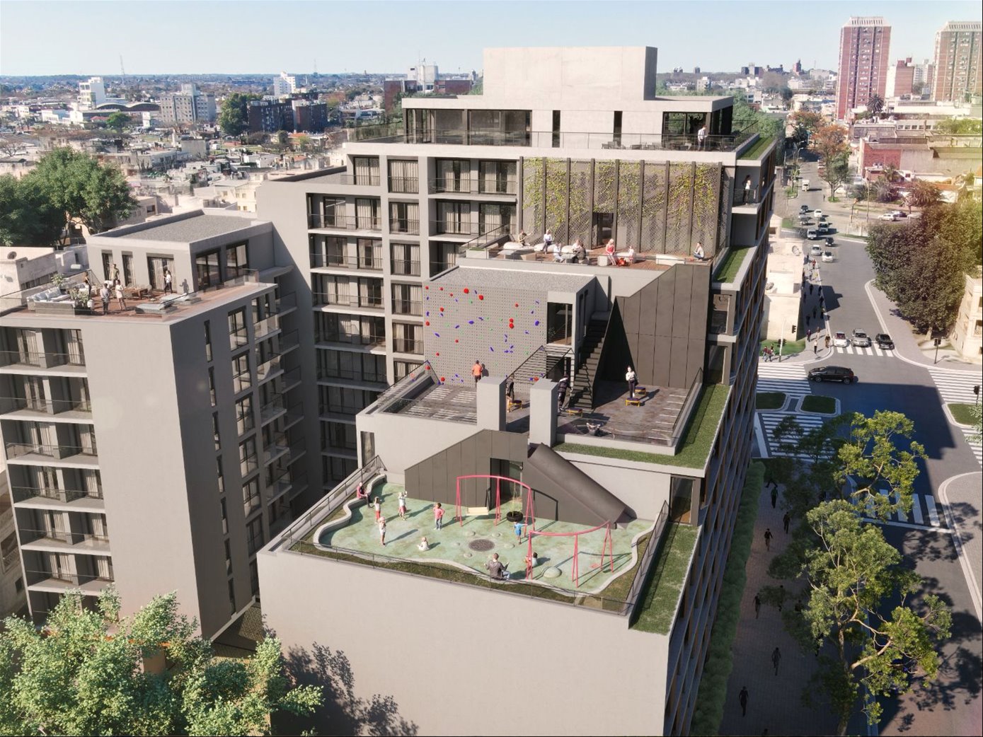 Complejo residencial de 209 apartamentos monoambientes, de 1 y 2 dormitorios, distribuidos en tres edificios con diseño moderno y enfoque sustentable.