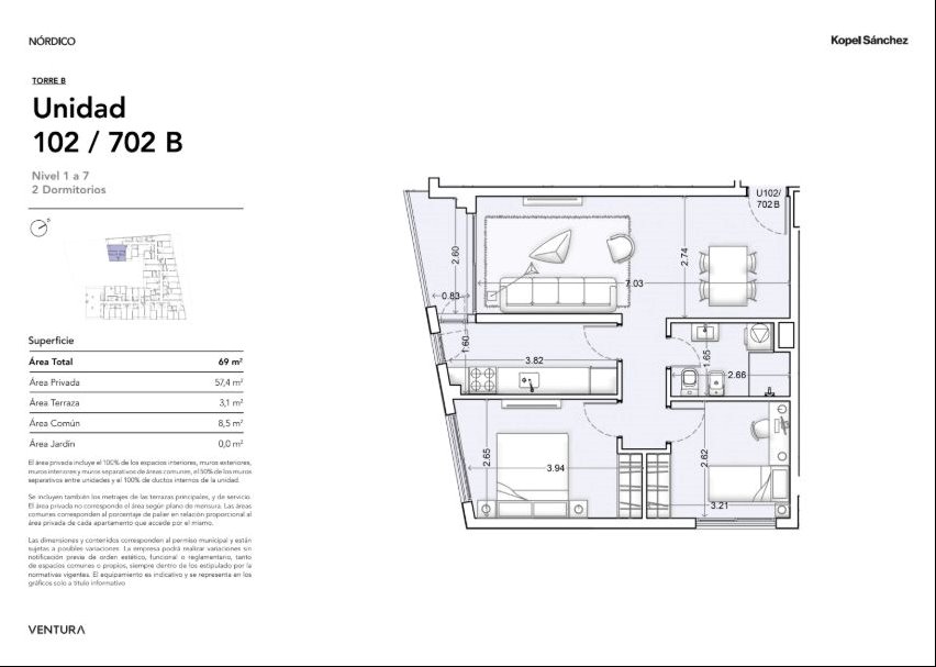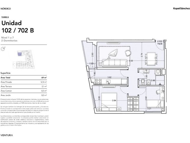 * Las superficies de los apartamentos incluyen muros divisorios hasta su eje, ductos, terrazas, balcones, prorrateo de área común, circulación vertical exclusivamente de planta.