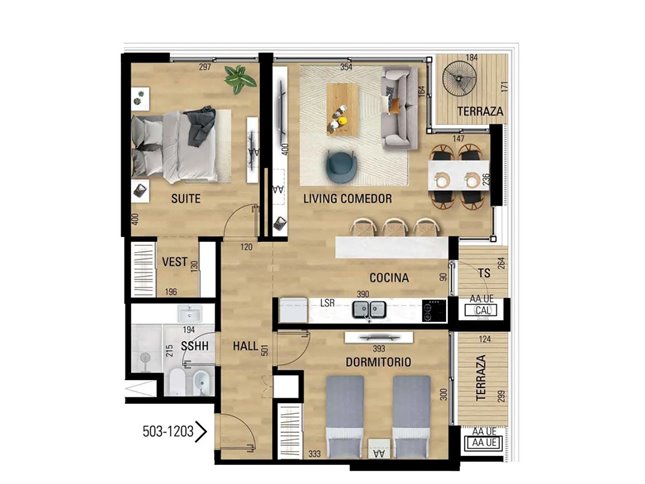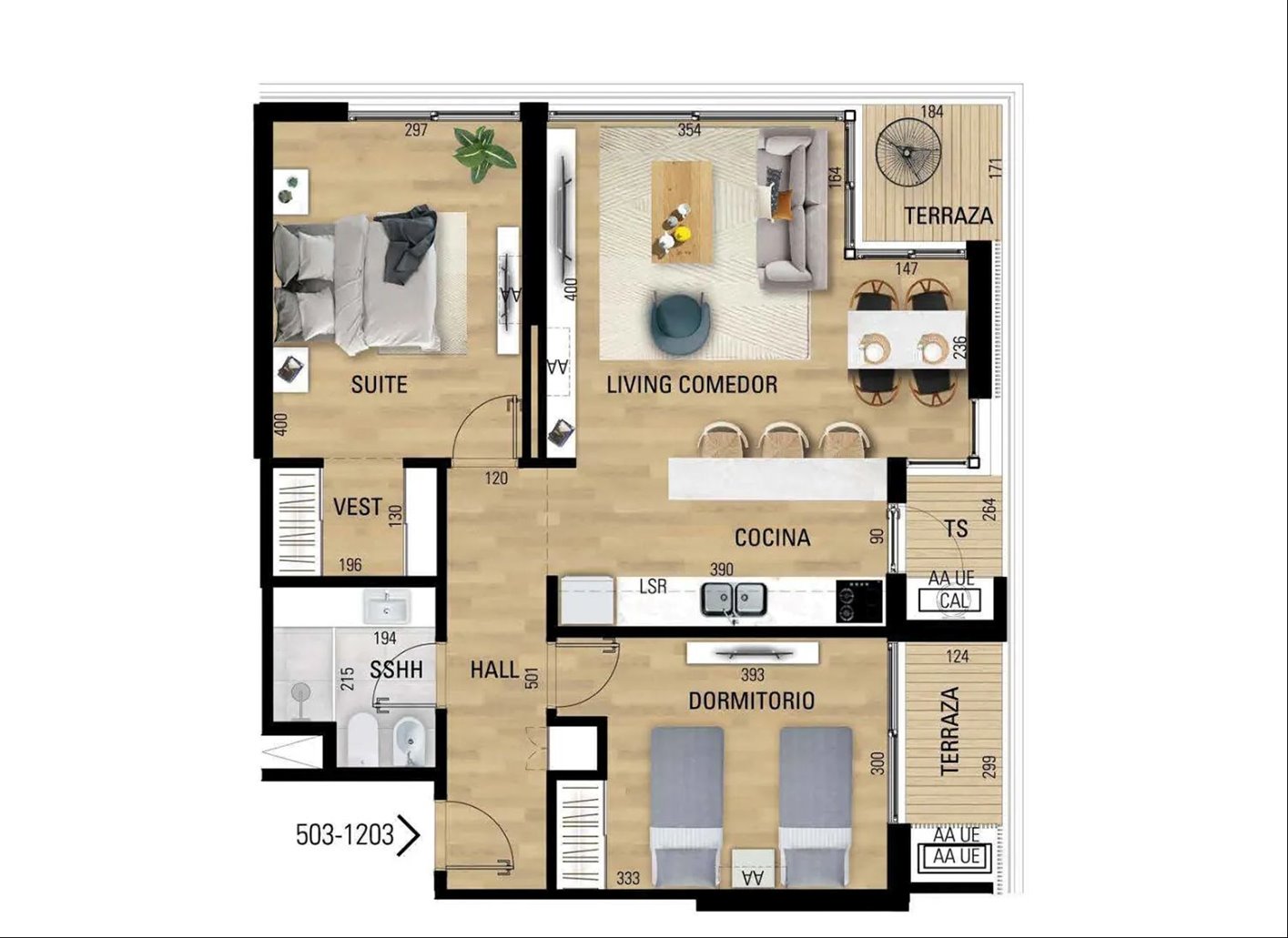 El living-comedor con cocina integrada ofrece una distribución funcional y moderna, con salida directa a una amplia terraza, generando un ambiente luminoso y confortable.