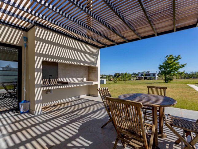 Acceso peatonal con porche de entrada, pérgola para vehículos y otra pérgola con parrillero. Piscina integrada al entorno, completando un espacio exterior pensado para disfrutar.