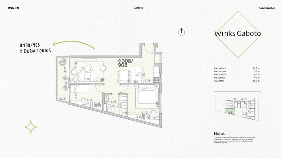 * Las superficies de los apartamentos incluyen muros divisorios hasta su eje, ductos, terrazas, balcones, prorrateo de área común, circulación vertical exclusivamente de planta.