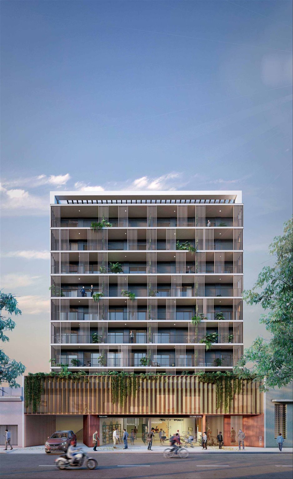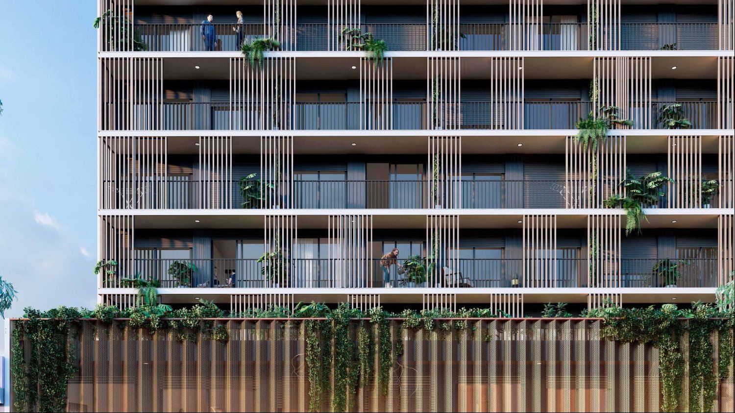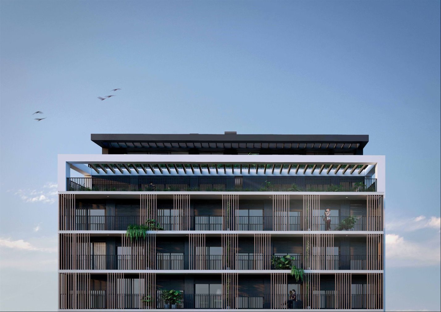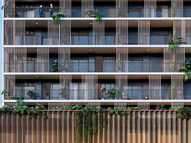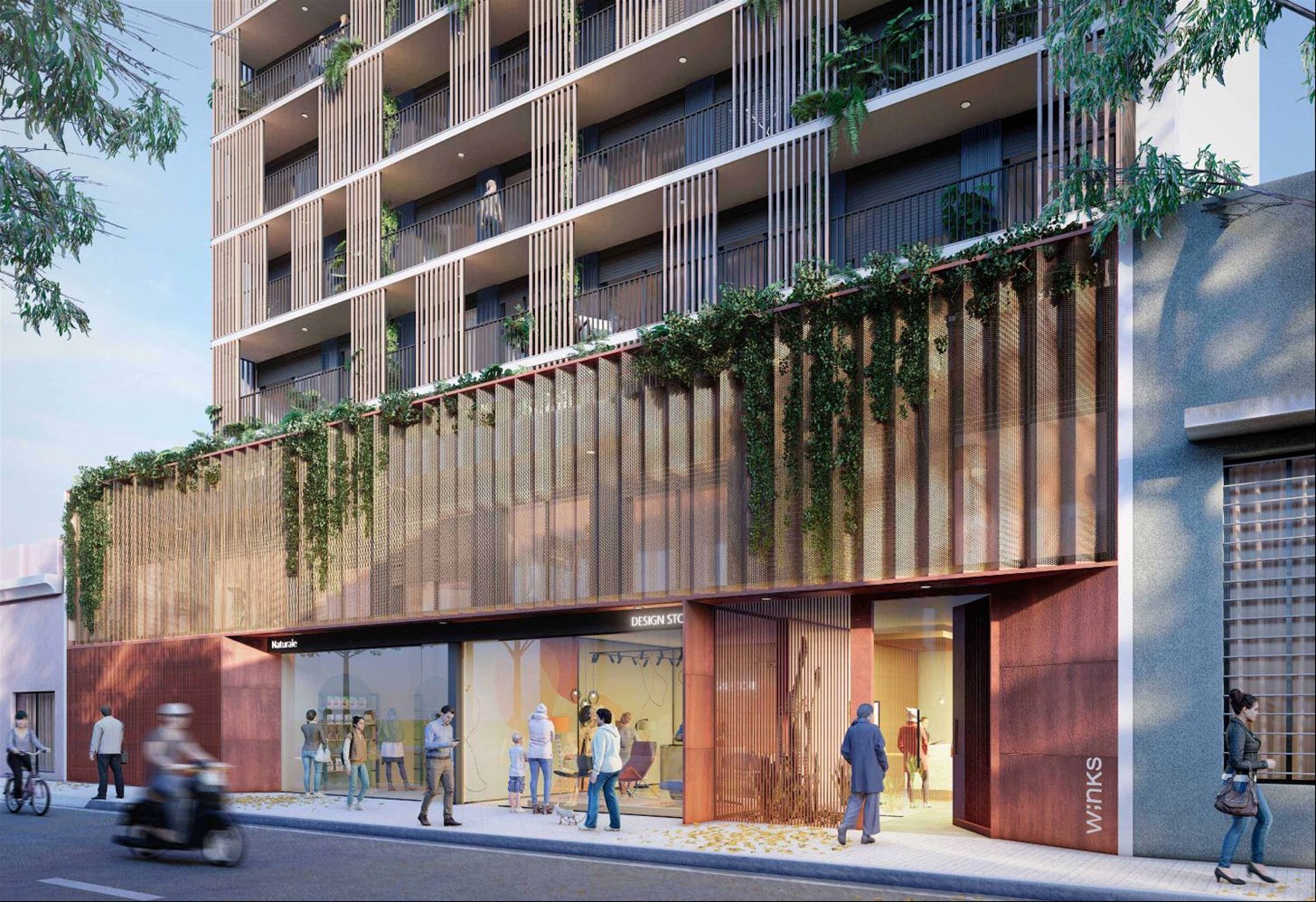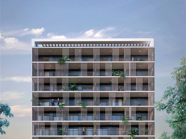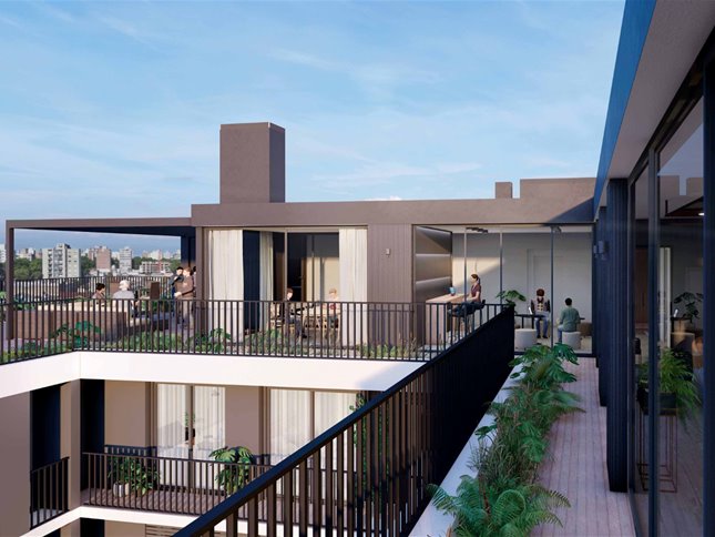 Edificio de 10 pisos con unidades monoambientes, 1 y 2 dormitorios, todas con terraza y diseño luminoso y contemporáneo.