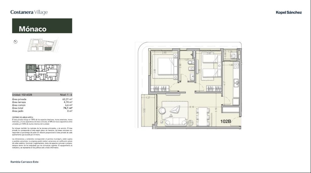 * Las superficies de los apartamentos incluyen muros divisorios hasta su eje, ductos, terrazas, balcones, prorrateo de área común, circulación vertical exclusivamente de planta.