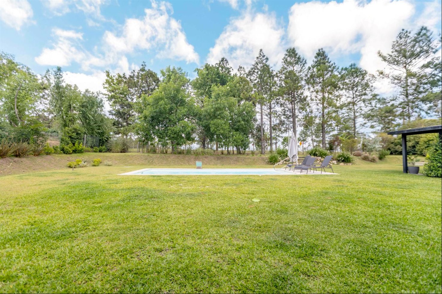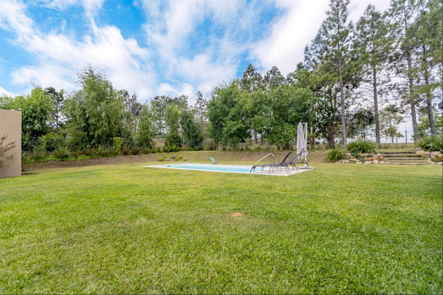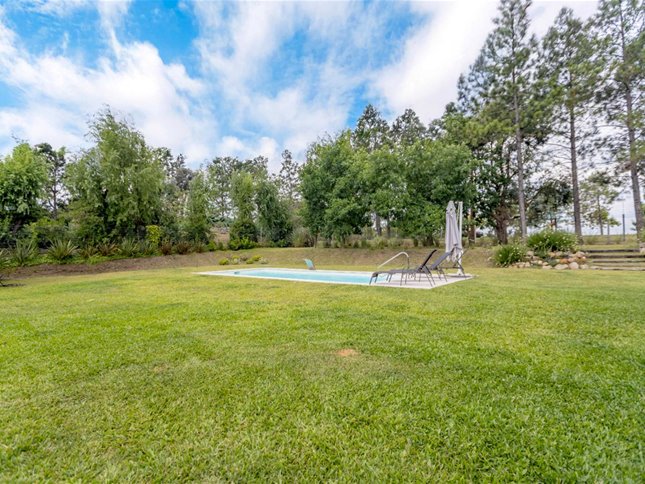 Conjunto de dos casas conectadas, con jardín y piscina en común, sobre lote de 2.300 m² y 525 m² edificados (incluye pérgolas).