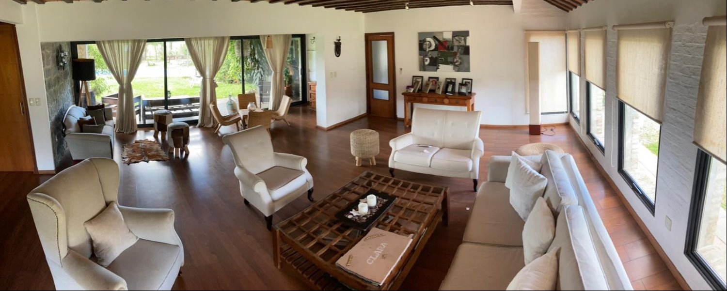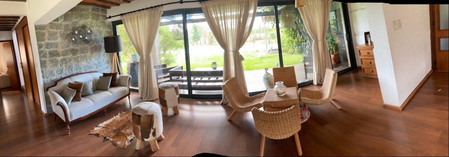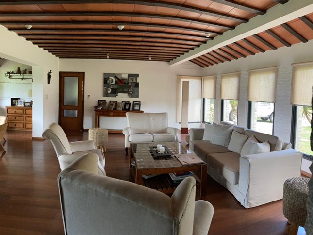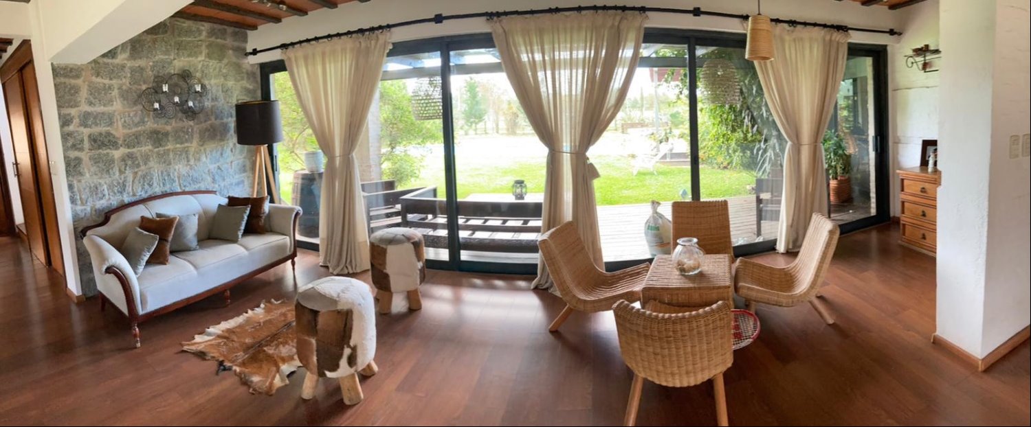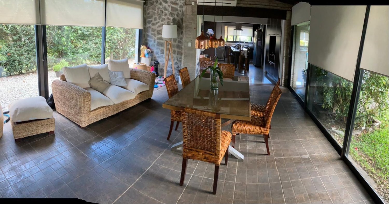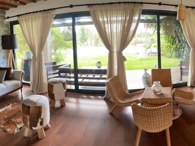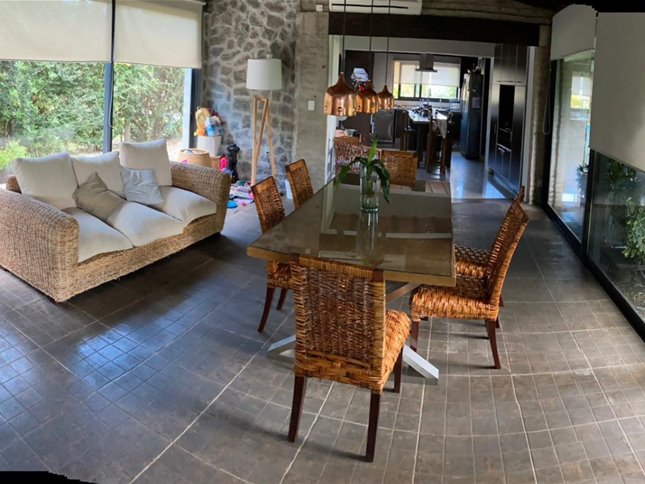 Amplia y muy luminosa. Living comedor con estufa a leña y grandes ventanales con vista al jardín. Baño social. Cocina integrada con muebles sobre y bajo mesada, y comedor diario. Lavadero. Servicio completo.