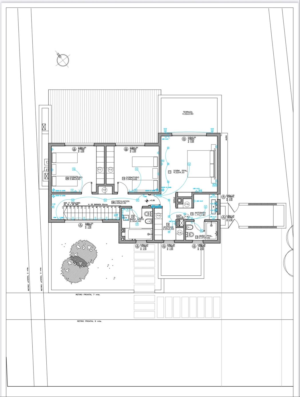Planta alta: suite principal con vestidor, baño y balcón al jardín; dos dormitorios adicionales con baño completo.