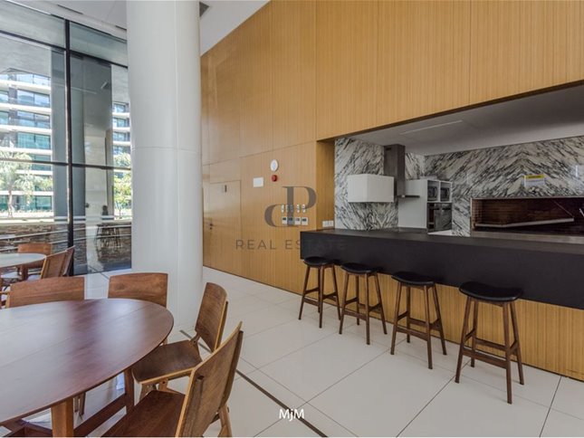 Living comedor luminoso, muy luminoso, con salida a una espectacular terraza y vista a la piscina. Cocina integrada con desayunador y equipada con campana, anafe y horno eléctrico.