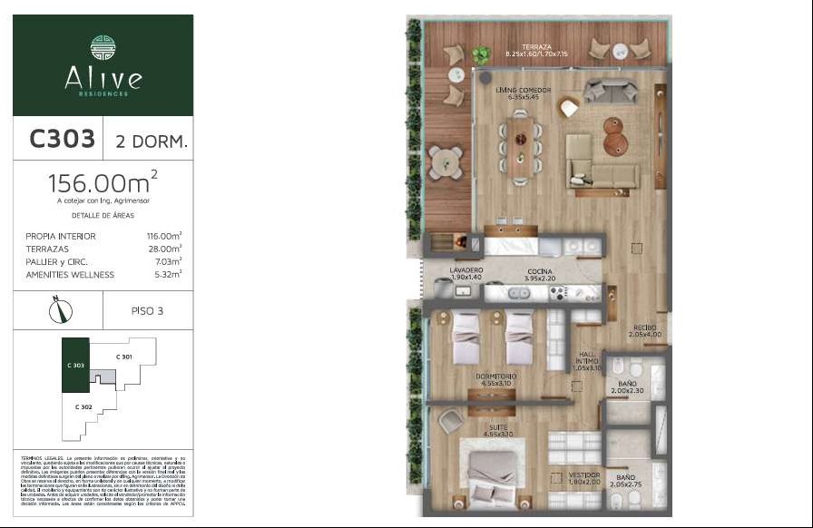 * Las superficies de los apartamentos incluyen muros divisorios hasta su eje, ductos, terrazas, balcones, prorrateo de área común, circulación vertical exclusivamente de planta.