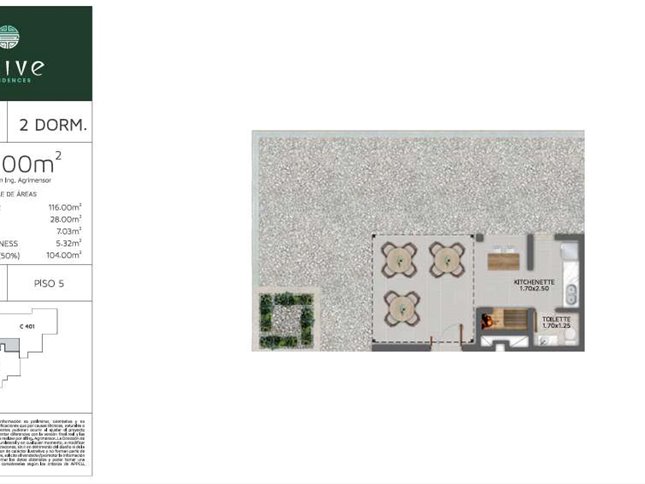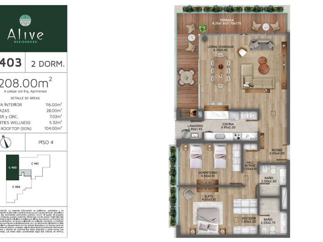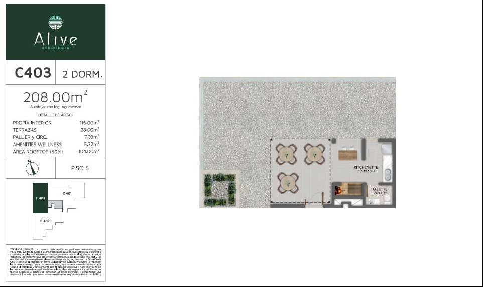 * Las superficies de los apartamentos incluyen muros divisorios hasta su eje, ductos, terrazas, balcones, prorrateo de área común, circulación vertical exclusivamente de planta.
