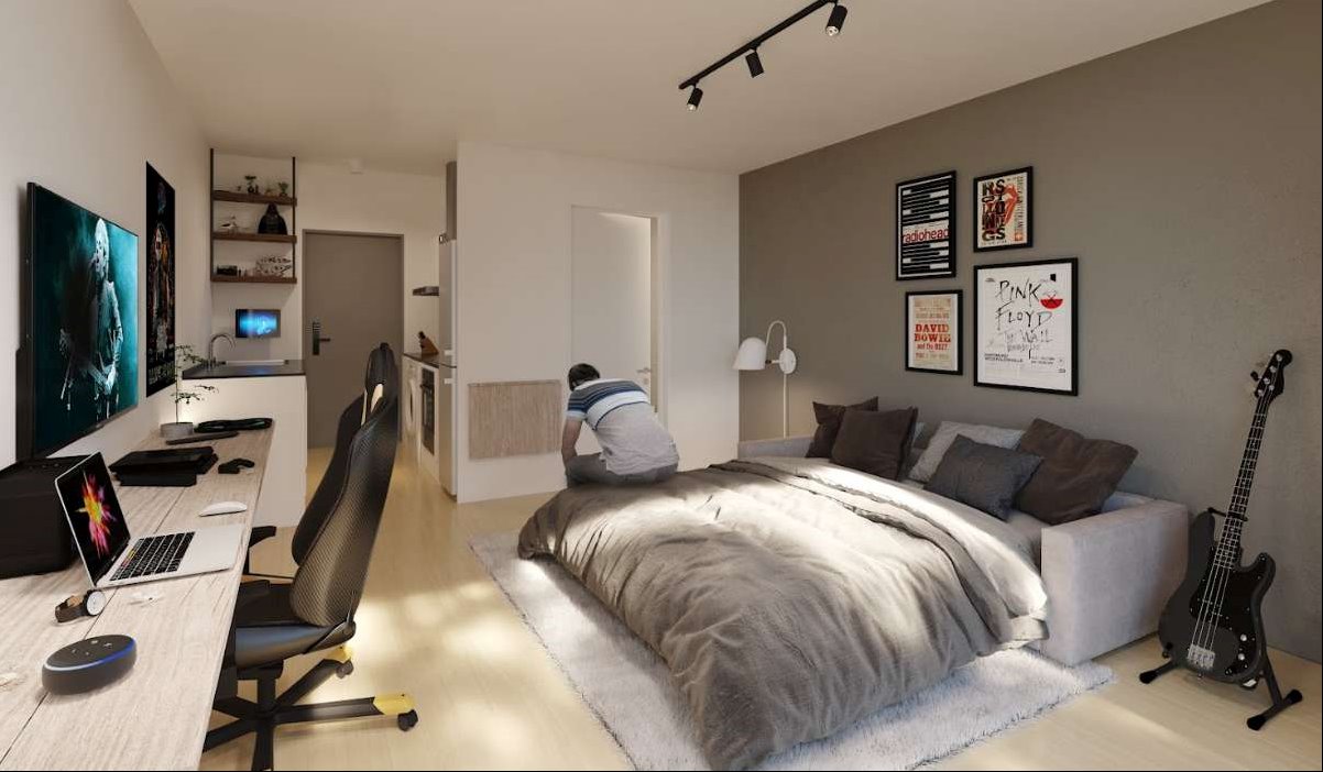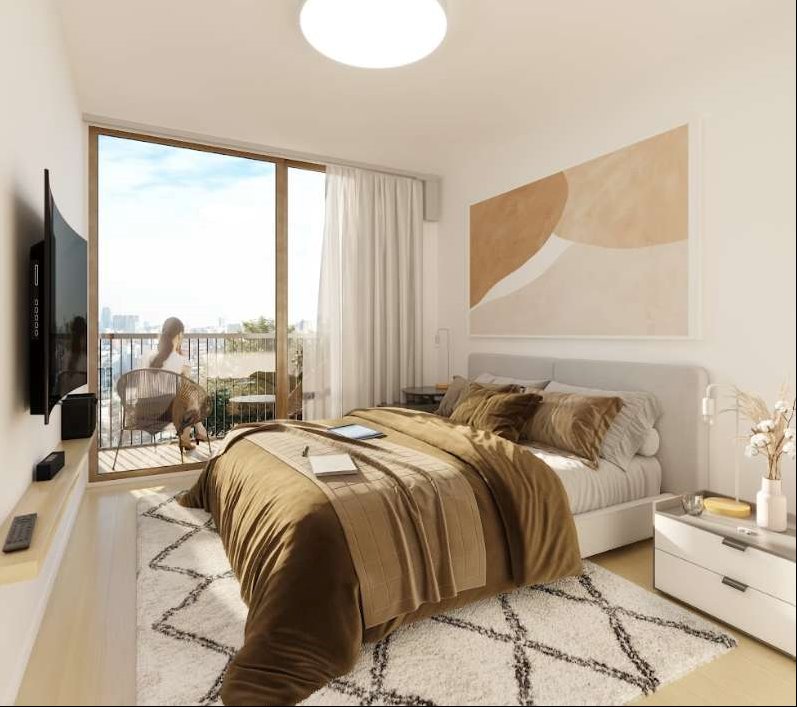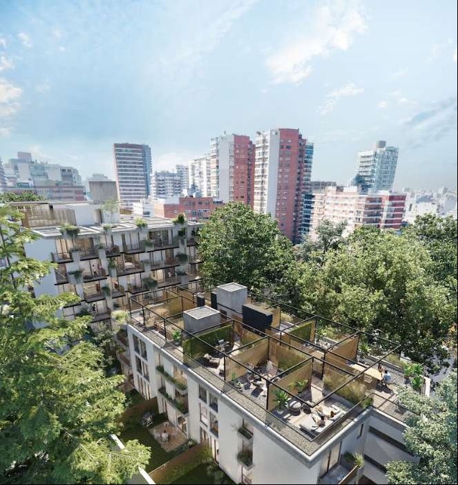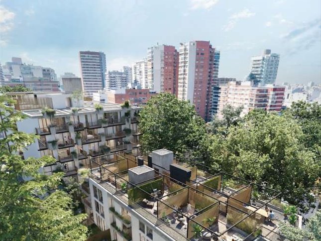 Ofrece apartamentos de 1 y 2 dormitorios, distribuidos en tres bloques integrados por patios verdes, con un total de 81 unidades.