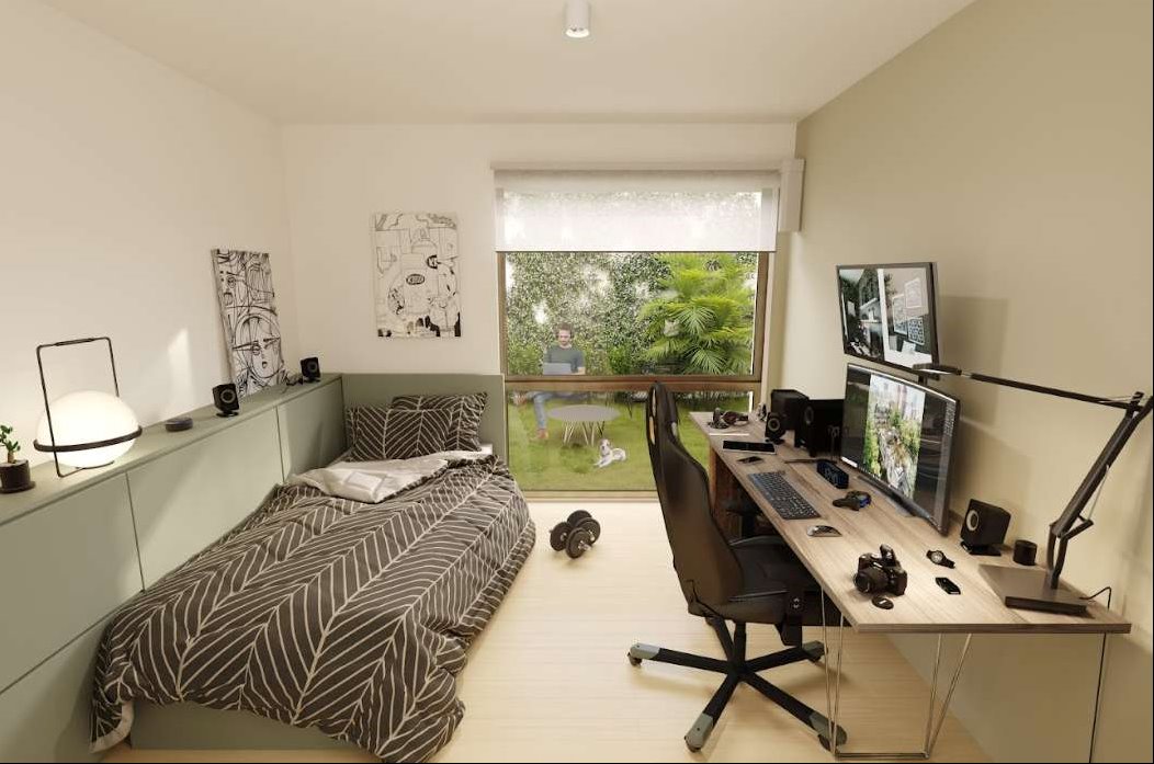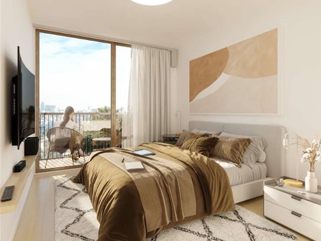 Ofrece apartamentos de 1 y 2 dormitorios, distribuidos en tres bloques integrados por patios verdes, con un total de 81 unidades.