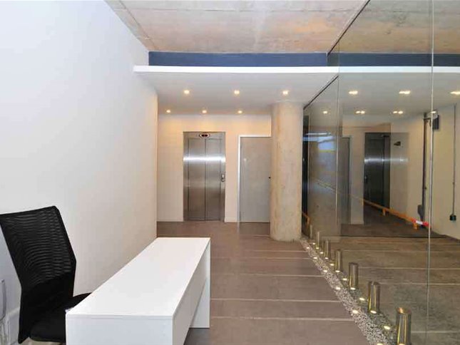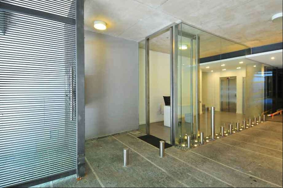Edificio moderno con espacios comunes en la última planta y portería.