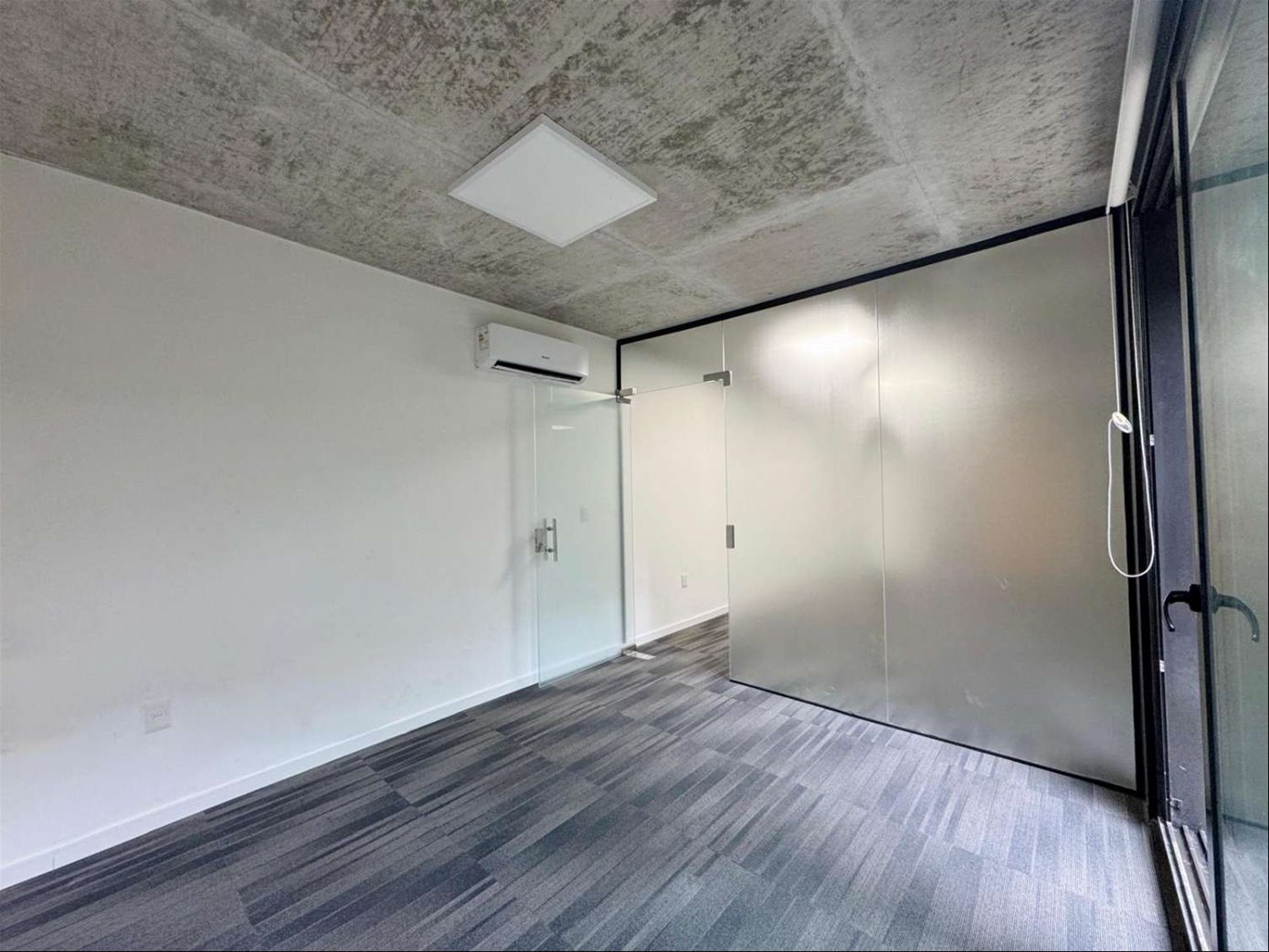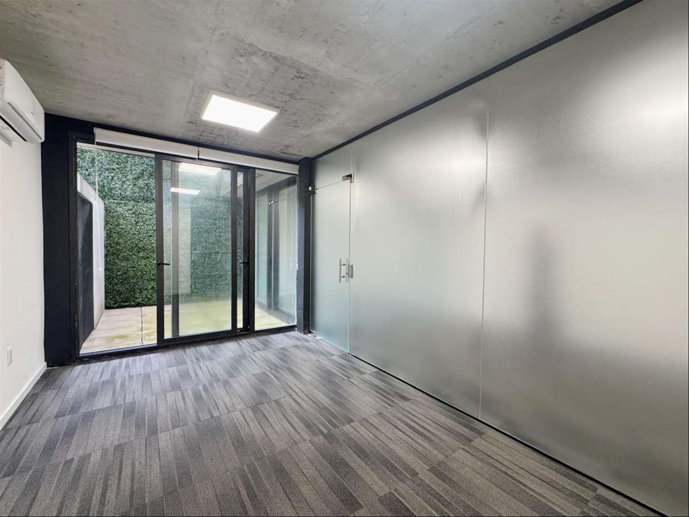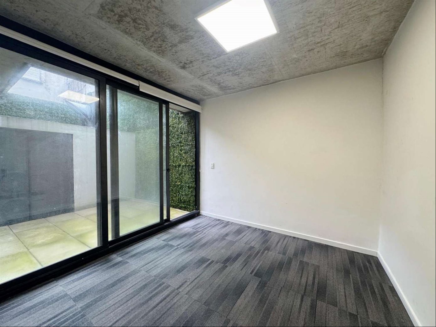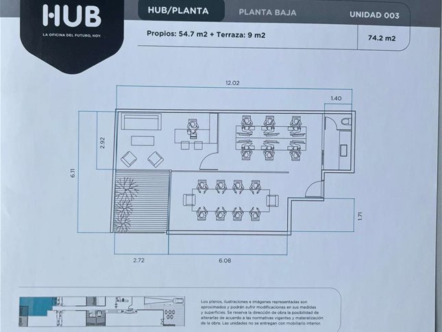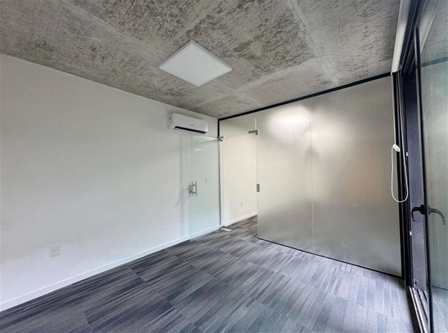 Cuenta con 54 m² interiores bien aprovechados y 9 m² de patio de uso exclusivo. La planta se organiza en dos espacios definidos, permitiendo adaptar cómodamente área de trabajo y privado o sala de reuniones. Dispone además de kitchenette, baño completo y garaje para un vehículo.
