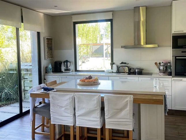 Se accede por un hall de entrada con despojador que conduce a un luminoso living comedor con grandes ventanales, estufa a leña de alto rendimiento y salida a galería con pérgola y parrillero. Toilette. Cocina definida, espaciosa, con isla y opción de integrarse mediante puertas corredizas.