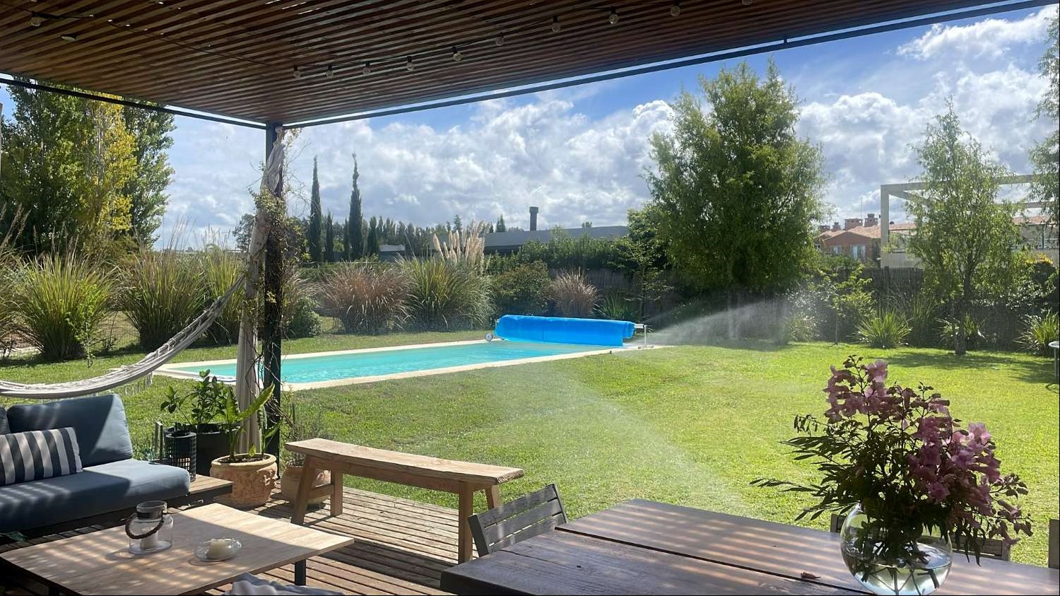 El área social se conecta a una amplia galería, logrando un espacio interior-exterior fluido. Jardín parquizado con riego automático y piscina climatizada.
